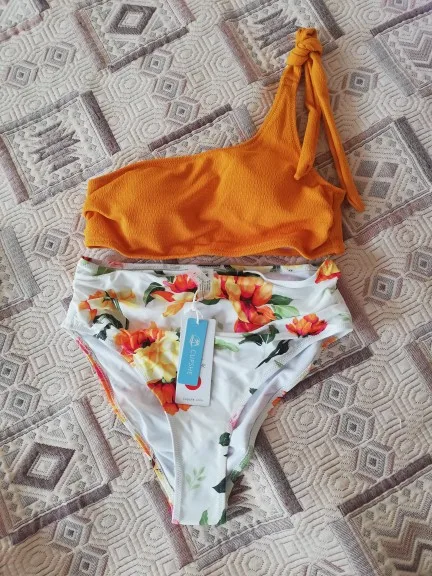 Orange and Floral One-shoulder High-waisted Bikini Set