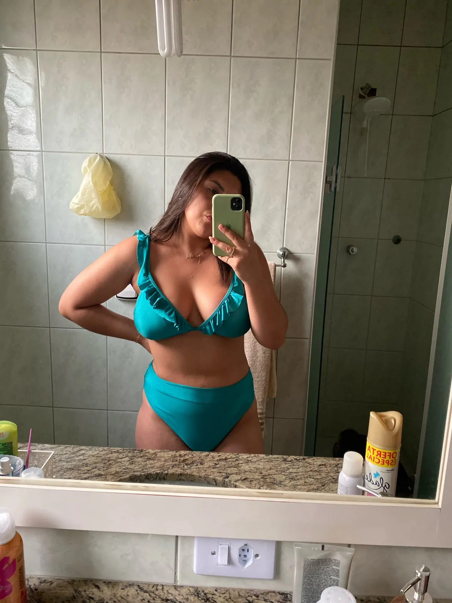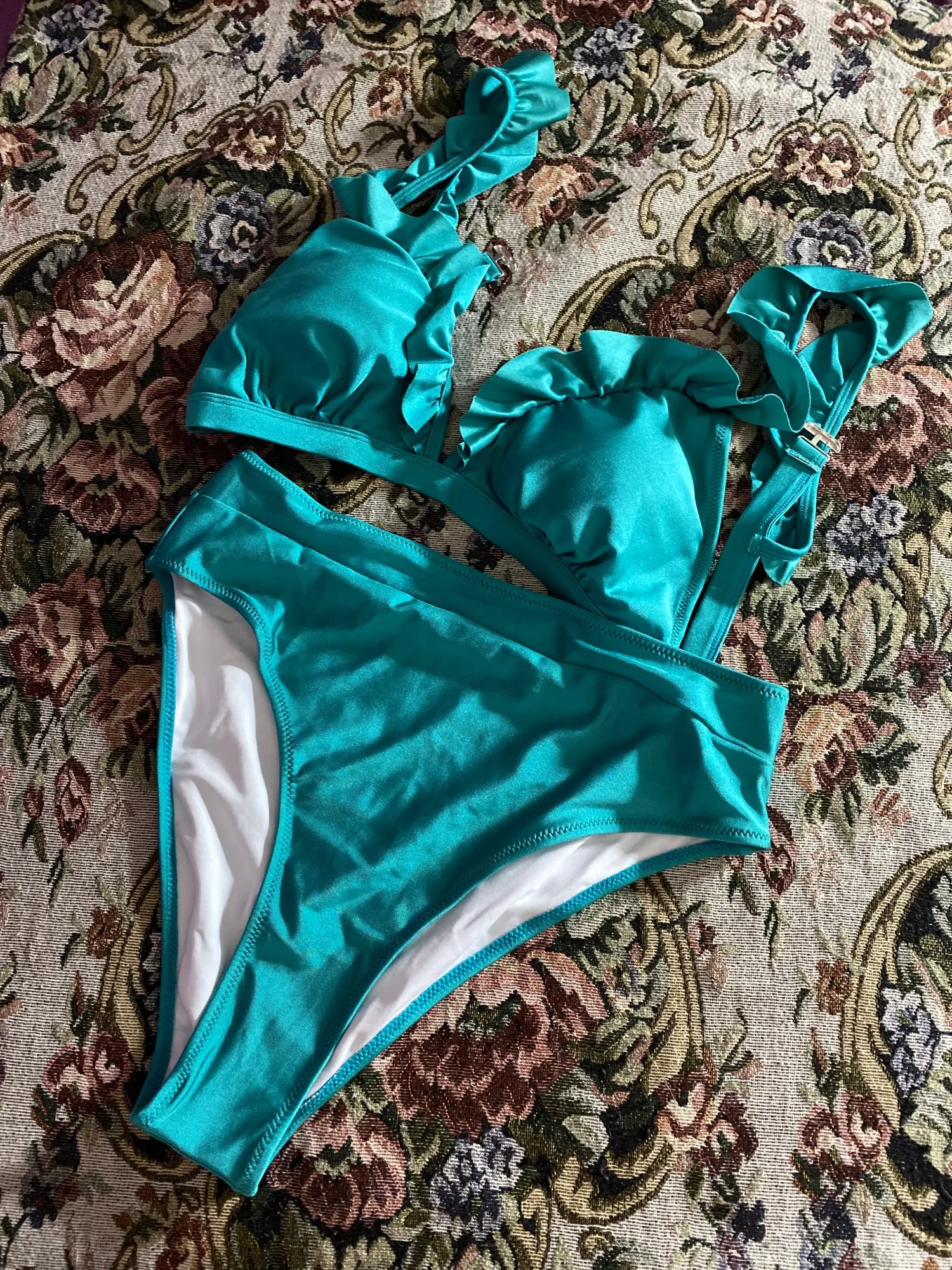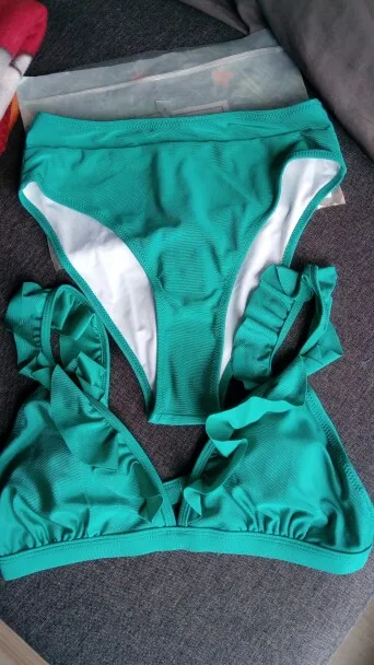 Solid Red Green Ruffled High-Waisted Bikini Set