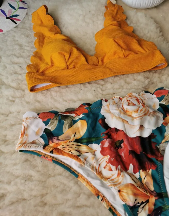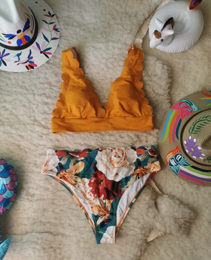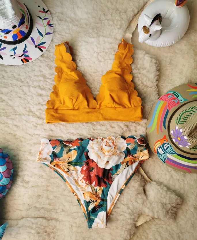 Yellow and Floral Scalloped Bikini Set