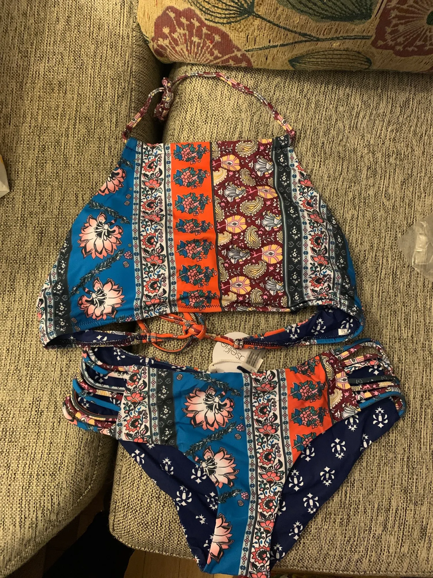 Top is ill fitting. There’s not really a band, you just have to tie it tightly which is kind of uncomfortable. I’ll probably buy a solid top at target to go with the bottoms because they are perfect.