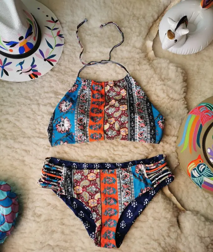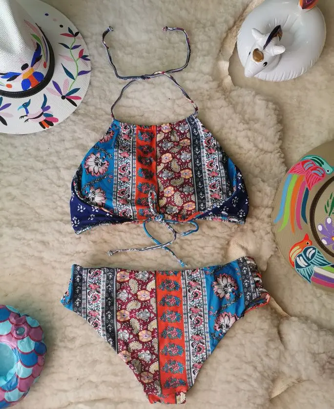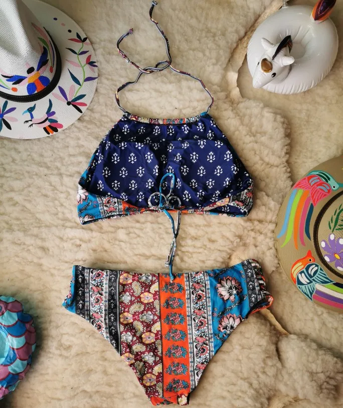 Boho Blue Print Halter Low-waist Bikini Set