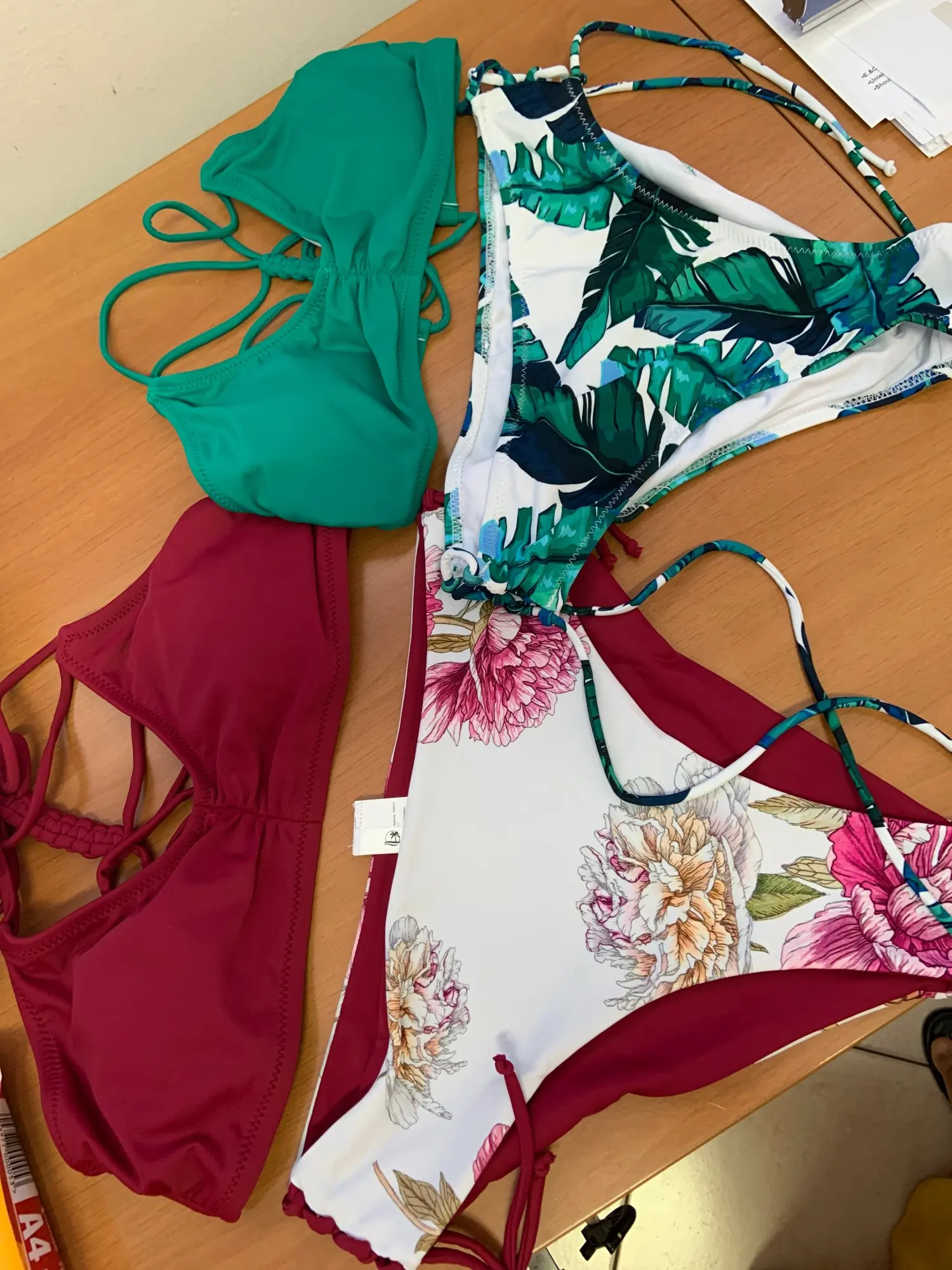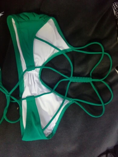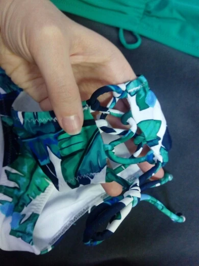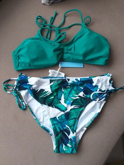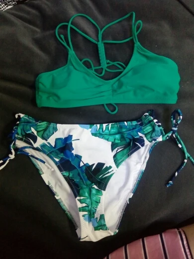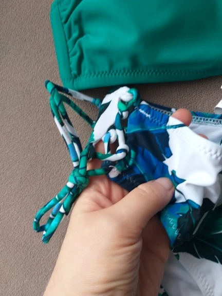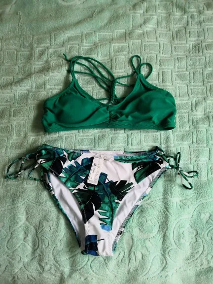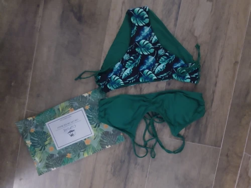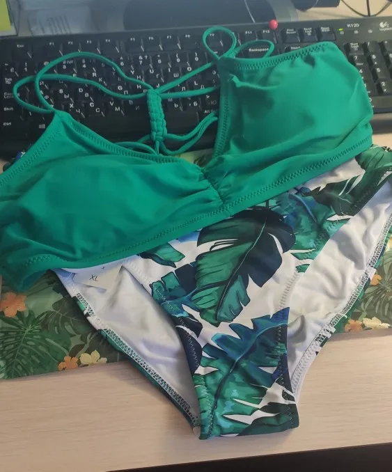 Chic swimsuit with two-sided swimming trunks. The size of my Xs perfectly approached the parameters 84/64/94-good bottom on the strings, and easily adjustable to the right volume. The top is also on the strings, but the length of the straps is not adjustable, only in volume under the breast. In this way, this size for girls is higher and with a large volume of the chest will be small. I'm good. At the top are removable cups, there are side bones. The back is decorated very beautifully. Sits comfortably. The bottom is double-sided, one side is palm leaves on a black background, the second is in the tone of the top. On the sides are ties criss-cross. The strings themselves-as I like-are narrow, thin, smooth and seams inside. Unpacking on my YouTube is Irenka 235 My reviews with photo/video in Instagram-iren_ka_ali, Facebook - Irenka.Ali, Telegram-irenka_ali