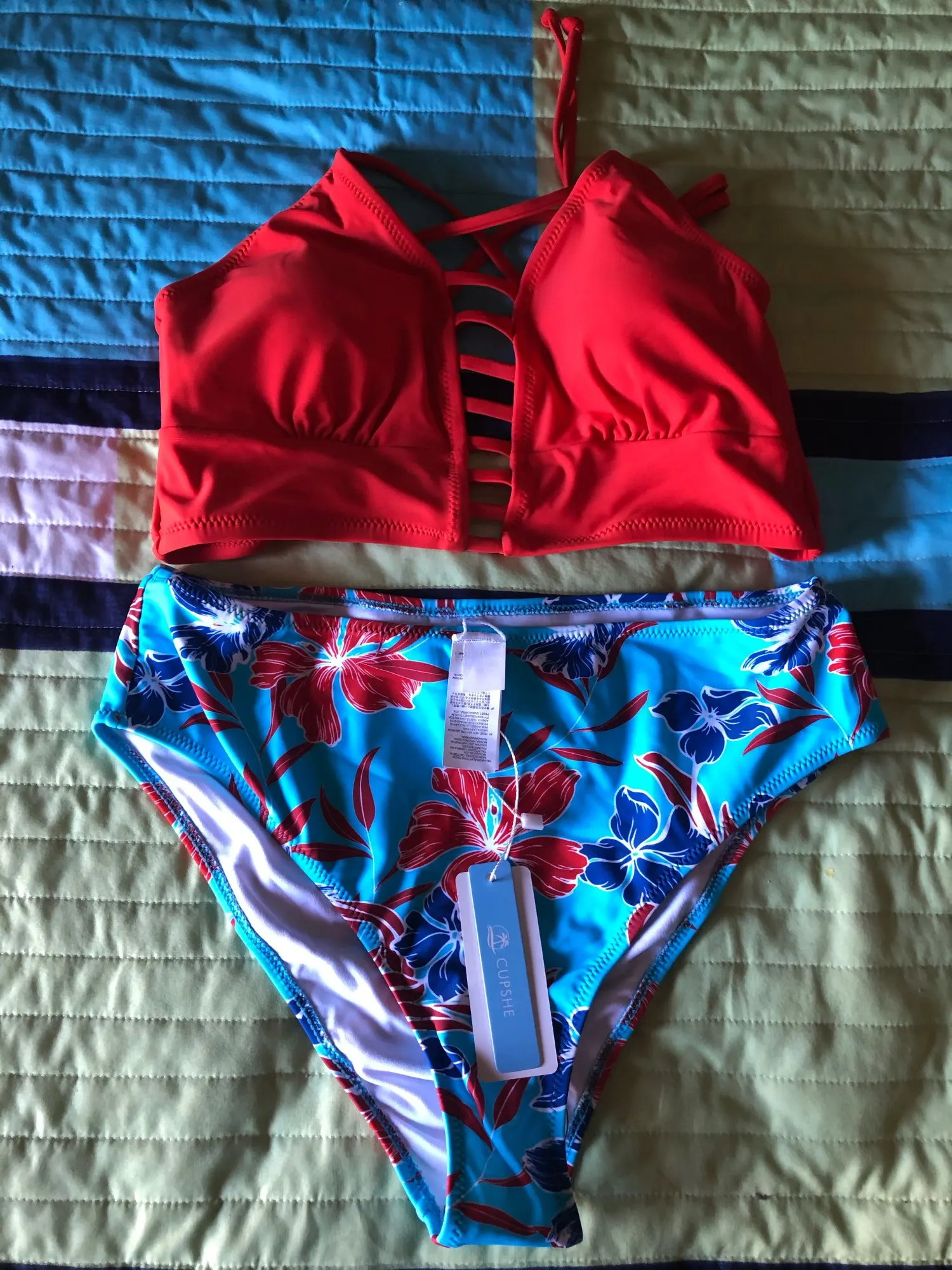 Red And Blue Floral Mid-waist Bikini Set